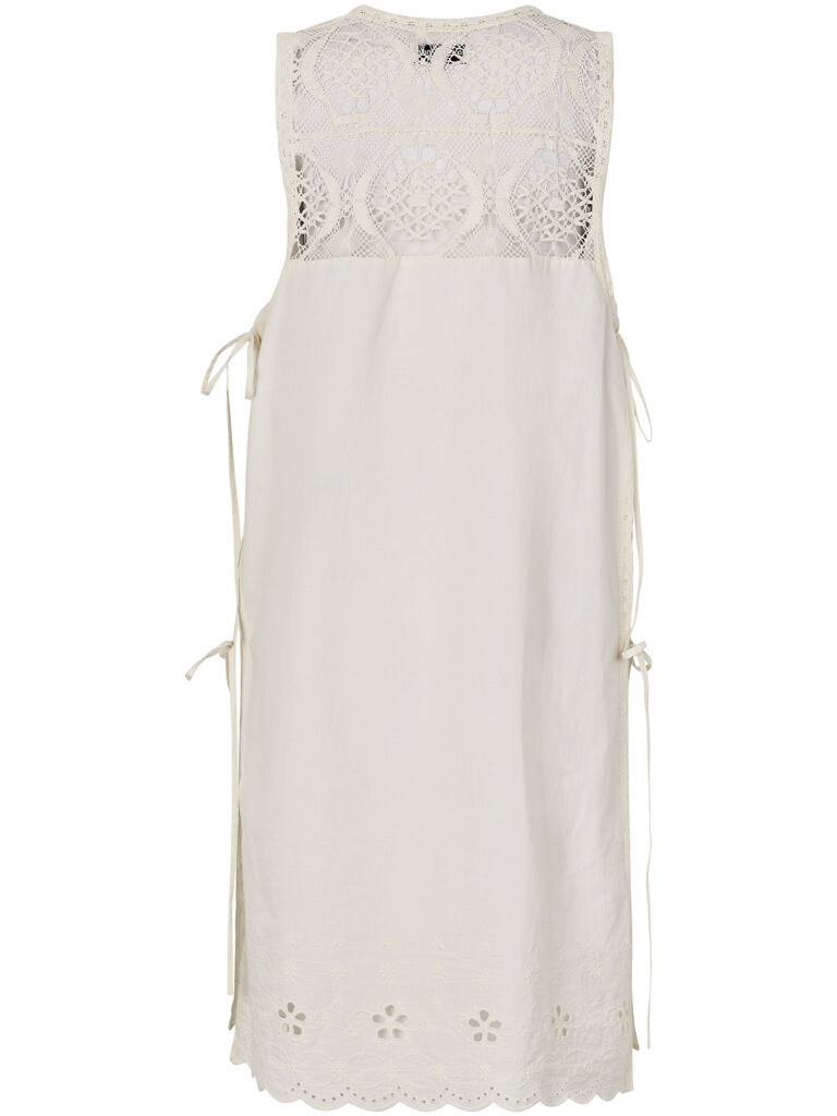 Lang, let top fra Lollys Laundry, med feminine broderie anglaise-detaljer, der tilfører et romantisk og luftigt udtryk. Modellen har en løs og afslappet pasform, som falder flot over kroppen, og de fine udskæringer langs kanten giver et elegant finish. Den ærmeløse silhuet og lette kvalitet gør toppen ideel til lag-på-lag styling – brug den over en skjorte eller alene på varme dage. Toppen har dekorative bindebånd i siderne, som skaber et unikt look og giver mulighed for at justere pasformen. Perfekt til både hverdag og sommerlige anledninger, hvor komfort og stil går hånd i hånd.