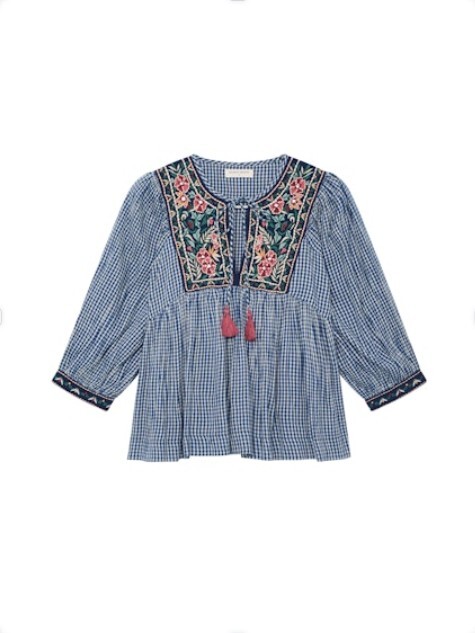 Elegant bluse fra Maison Hotel. Skjorten har en rund hals med en v-udskæring, hvor et fint bindebånd sidder, så den kan bindes tæt. Den er blå og hvid ternet med motiv af blomster og sten i smukke farver hen over brystet. For enden af ærmerne er også et smukt mønster for at gennemføre looket.