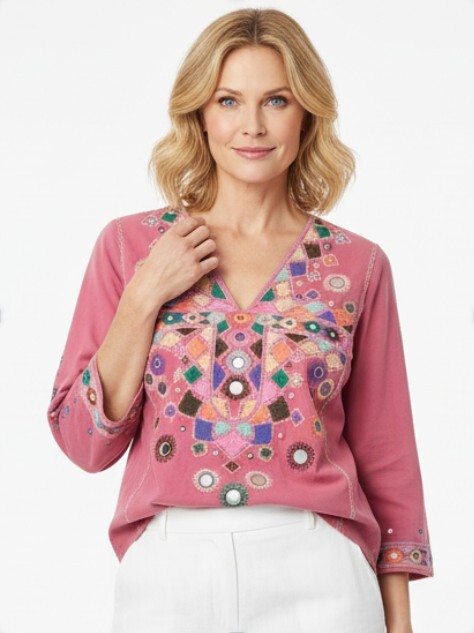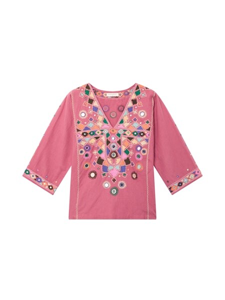 Skønneste bluse fra Maison Hotel. Blusen har ærmer med længde til omkring albuen og en smyk dyb v-udskæring. Den er mørk rosa og har smukke broderede detaljer foran og på ærmerne. Som en ekstra unik detalje er den designet med mini spejle blandt broderierne og langs ærmerne.