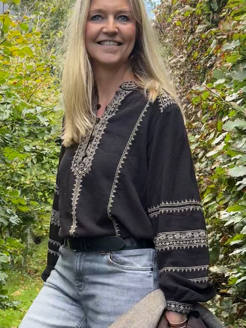 Fineste skjorte fra Maison Hotel. Denne skjorte er designet med en rund kina krave, samt crepet kvalitet, for at give skjorten struktur. Derudover er skjorten lavet med knaplukninger, lille puf ved skuldrene, samt smock i ærmerne for enden med knaplukning. Skjorten har fine sorte broderede detaljer, som giver den et feminint look.