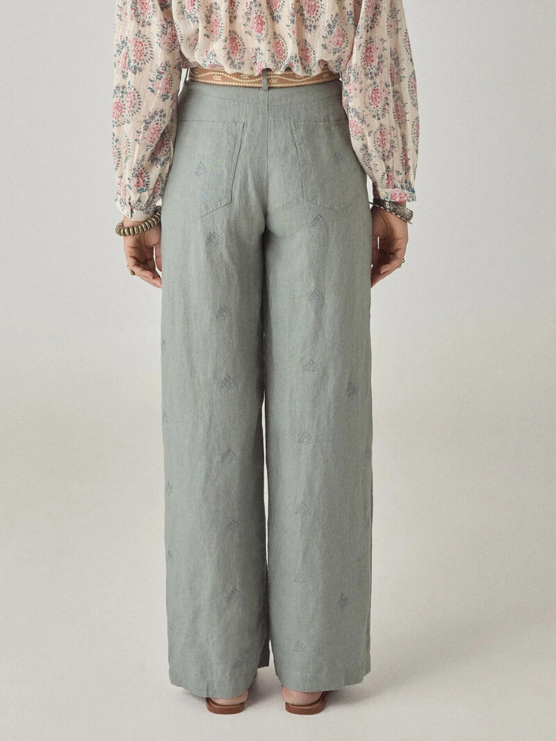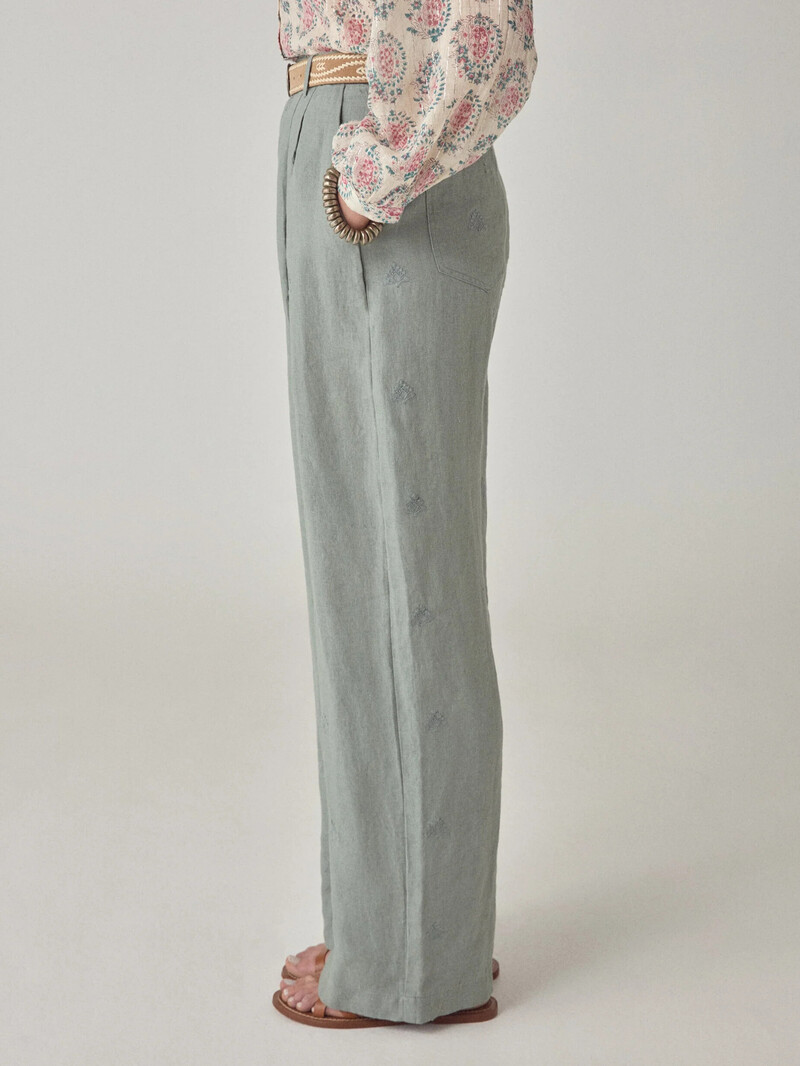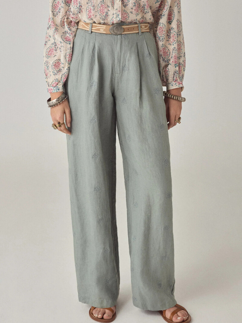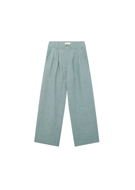 Fineste blå-grønne bukser i en lækker kvalitet fra Maison Hotel. Bukserne er lange med brede ben med flotte læg foran. De lukkes med lynlås og knap foran. I taljen er der bæltestropper.