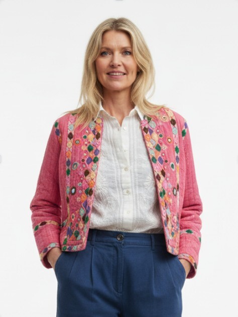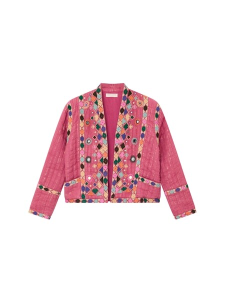 Lækreste bløde quiltede jakke fra Maison Hotel. Jakken har lange ærmer, er kort og bæres åben. Den er mørk rosa og har smukke broderede detaljer foran og på ærmerne. Som en ekstra unik detalje er den designet med mini spejle blandt broderierne.