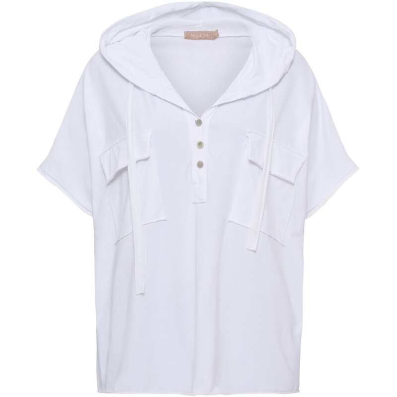 Smart bluse fra Marta med hætte. Blusen har korte ærmer, hætte, bindebånd i hætten. Den lukkes foran med knapper. Blusen kombinerer moderne og cool med en afslappet silhuet.