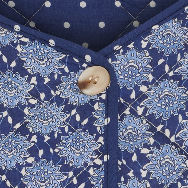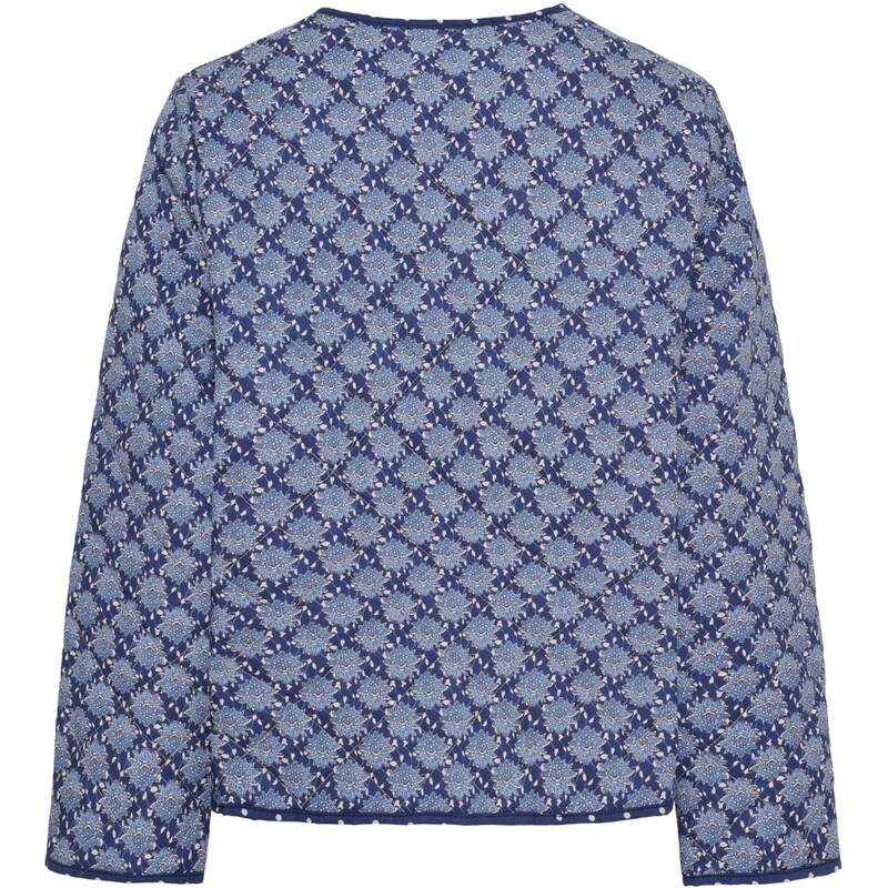 Smuk quiltet jakke fra Marta Du Château i den fineste navy nuance med dekorativt mønster. Jakken lukkes med knapper foran og har lange ærmer samt praktiske lommer i begge sider. Den er ikke vendbar, men gør sig ekstra flot, når ærmerne smøges op og det elegante prikkede for kommer til syne.