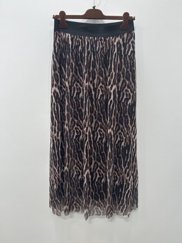 Smart lang nederdel fra Marta. Denne nederdel er designet med leo print, og en bred sort elastisk kant. Nederdelen er løs og flagrende med en fastsyet sort underkjole. Den er perfekt til både hverdag og fest.