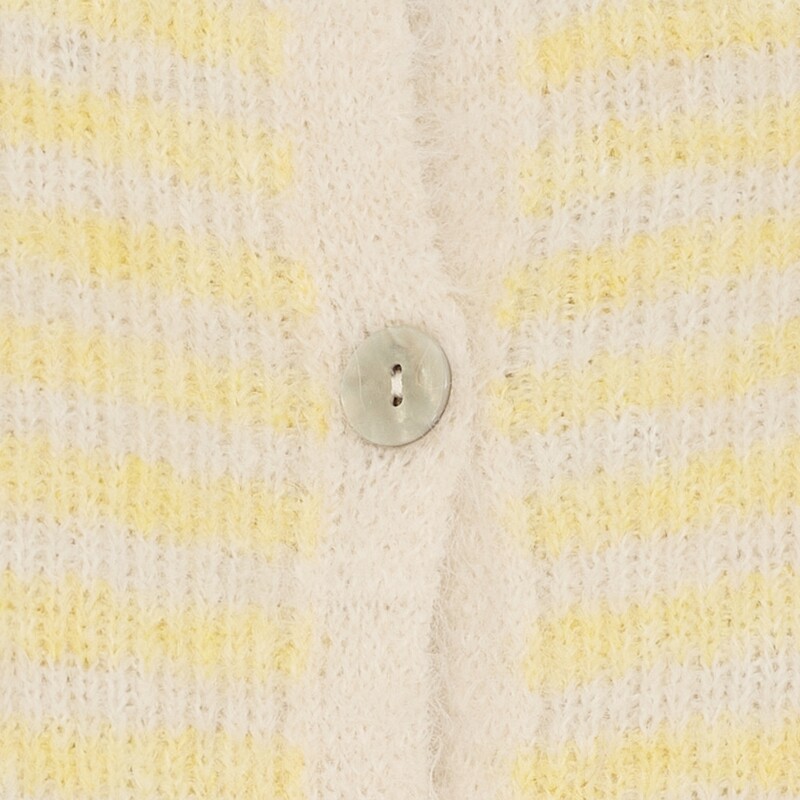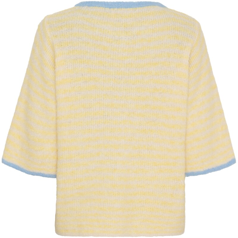 Sødeste strikkede trøje fra Marta. Striktrøjen har korte ærmer, en rund hals og et afslappende fit. Den har hvide og blå striber og gule kanter for et unikt look.