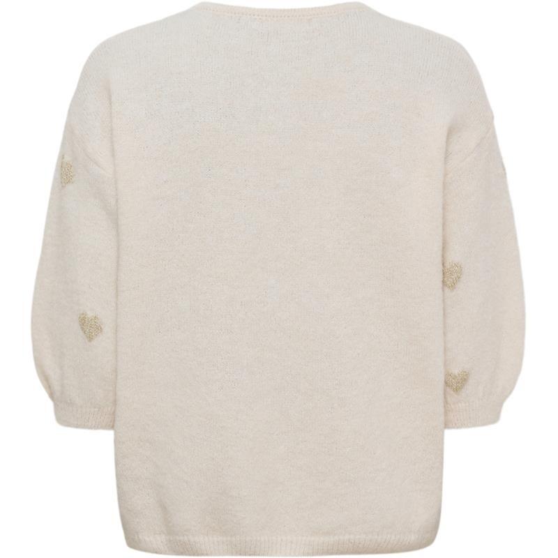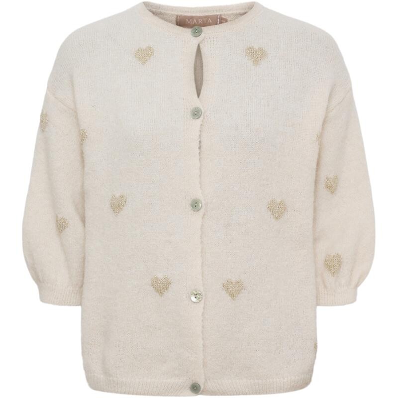 Sødeste strikket lyse cardigan/strik fra Marta. Den er gennemknappet, har en rund hals og 3/4 ærmer. Mønsteret med hjerter, gør strikken feminin og er samtidig enkel.