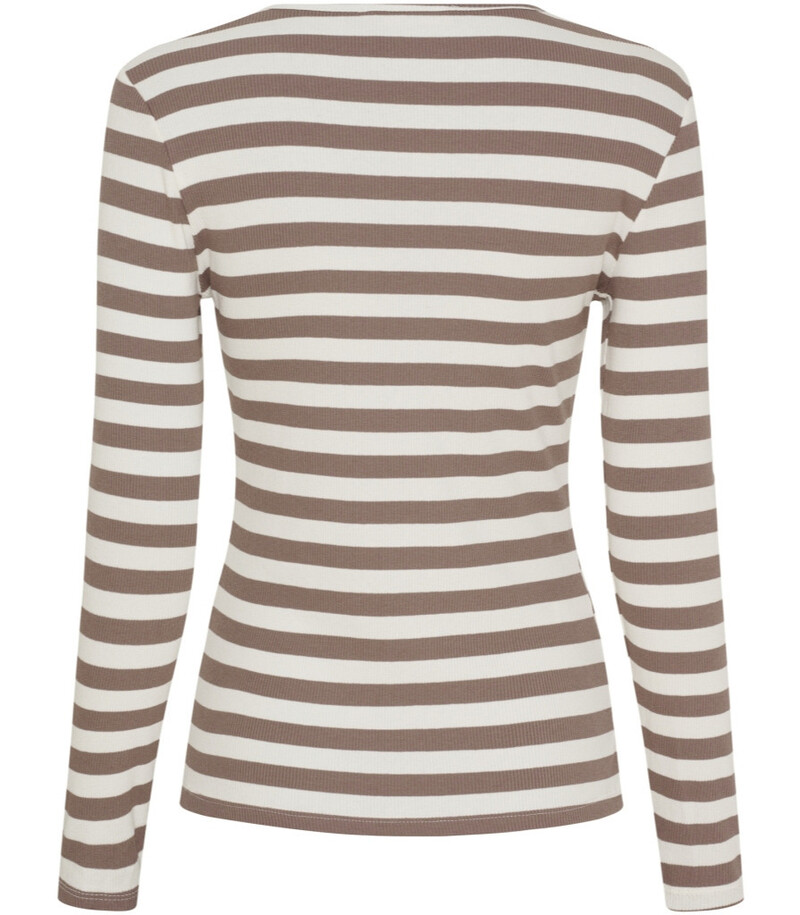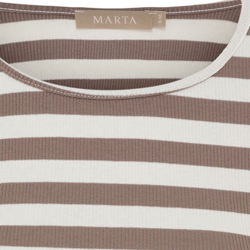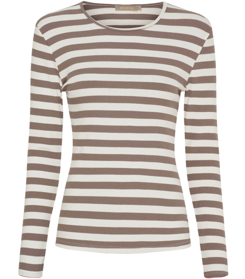 Lækker blød T-shirt fra Marta. T-shirten har lange ærmer, og er hvid med brede lysebrune striber. Den har rund hals og en behagelig tætsiddende pasform.