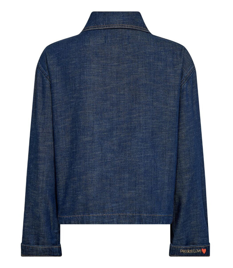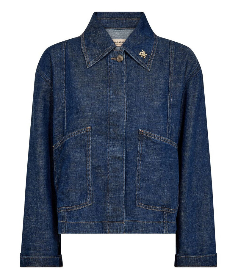 Lækker og let denimjakke fra Mos Mosh. Jakken har en karakteristisk krave med et lille logoemblem på den ene spids og lukkes med skjulte knapper, hvor kun den øverste knap er synlig. Den er designet med to store påsyede frontlommer samt lange ærmer med god vidde og afslappede, drop-down skuldre. Som en fin og personlig detalje er teksten “Passion Love” broderet på indersiden af det ene ærme nederst, hvilket kommer flot til syne, når ærmet foldes op.