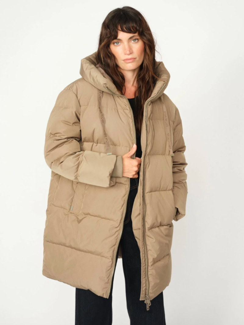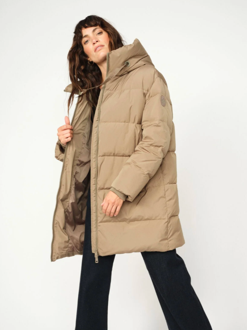 En lækker, varm dunfrakke fra Mos Mosh med elegante detaljer. Den lange model er designet med tovejs-lynlås, høj krave og justerbar hætte med snøre. Foran har jakken praktiske lommer med trykknaplukning, ribkant ved håndleddene og lynlåsåbninger i begge sider nederst, som giver ekstra bevægelsesfrihed.