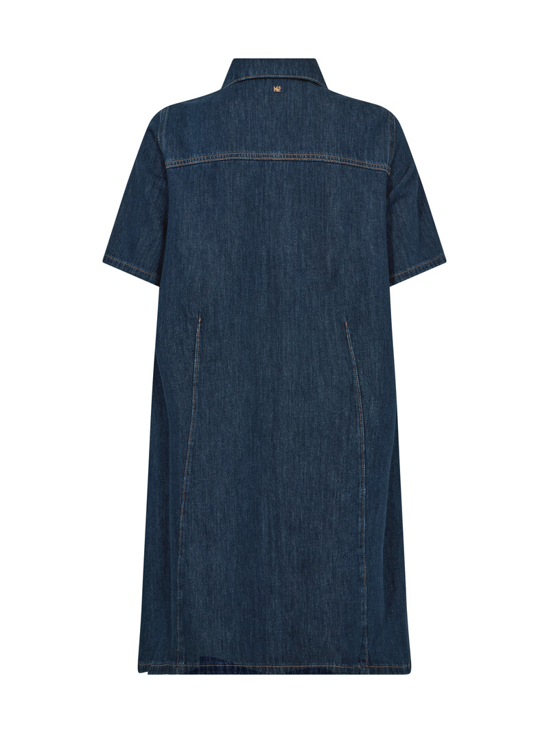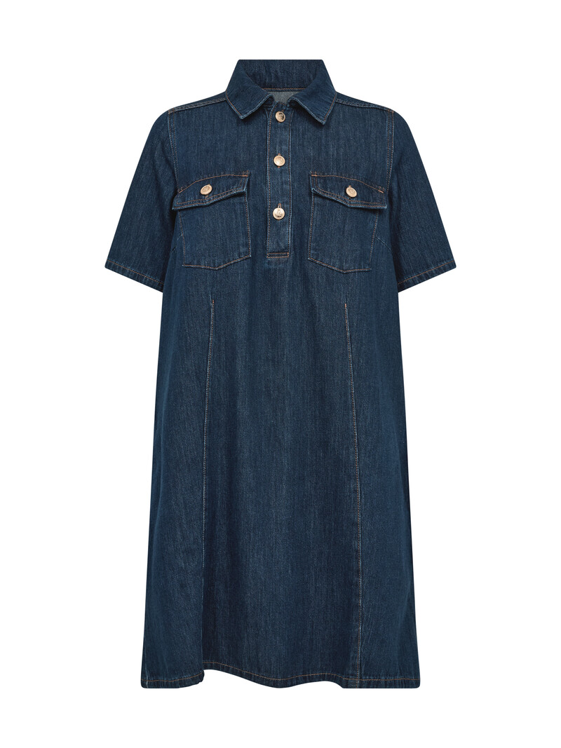 Cool og afslappet midi-kjole fra Mos Mosh. Kjolen har korte ærmer, en pasform der giver dig fri bevægelse hele dagen og en blød bomuldskvalitet der gør den behagelig at have på. Den har en klassisk skjortekrave, 2 frontlommer med flap og knapper. På brystet har kjolen fine guldknapper som lukning.