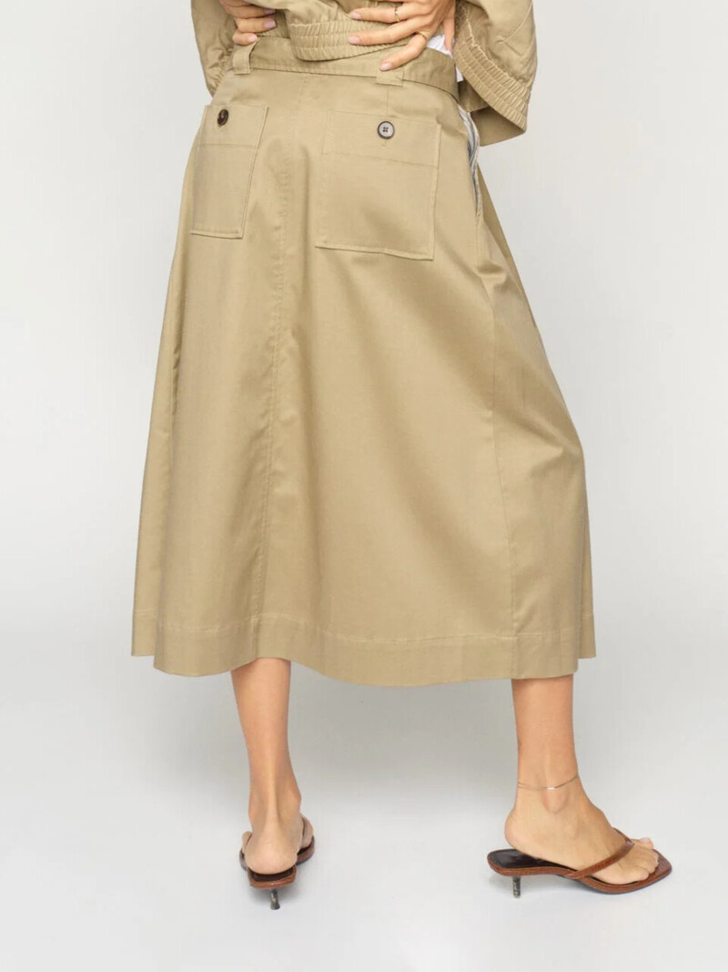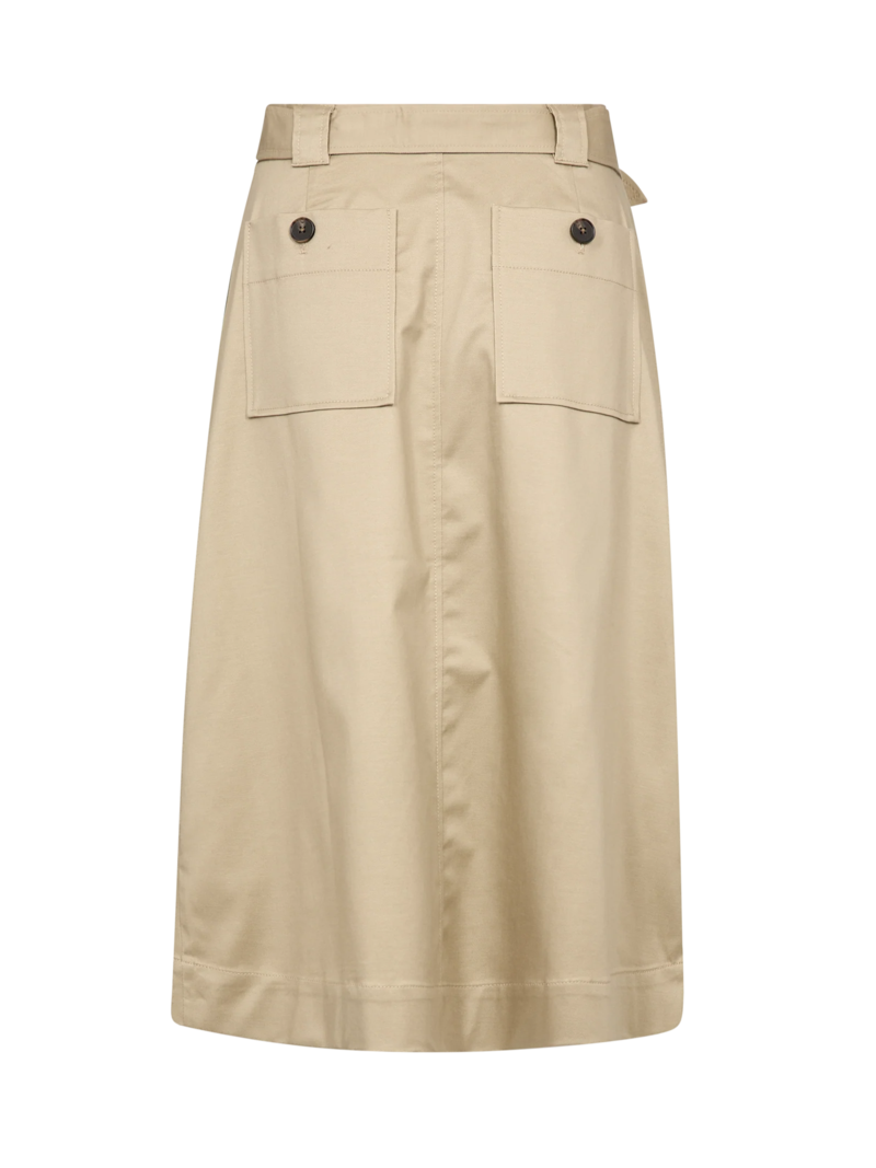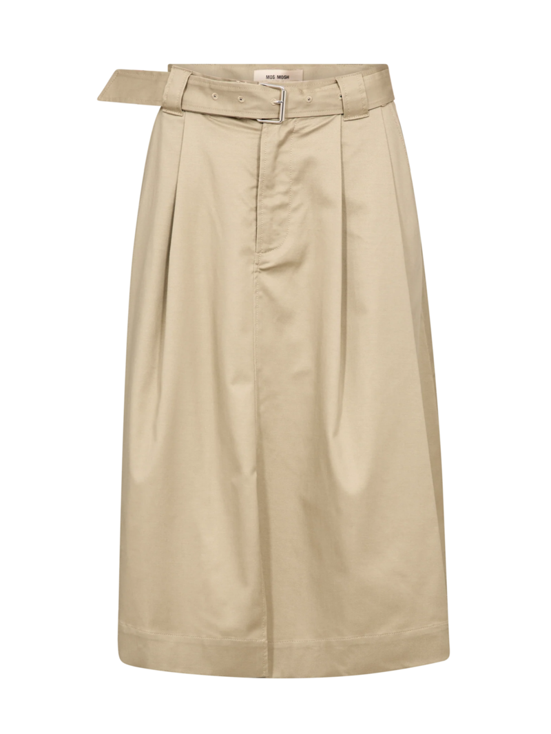 Cool nederdel fra Mos Mosh. Denne elegante nederdel forener moderne finesse med et subtilt utility-præg. Den har en regular pasform med en smigrende talje og integreret bælte, mens frontens læg og de diskrete baglommer tilfører struktur og karakter. Det glatte, lette materiale giver et flot fald og gør nederdelen velegnet til både hverdagsbrug og mere formelle lejligheder.