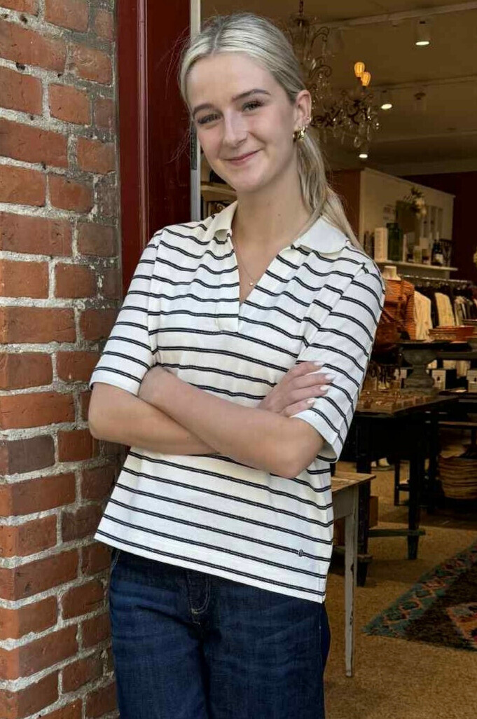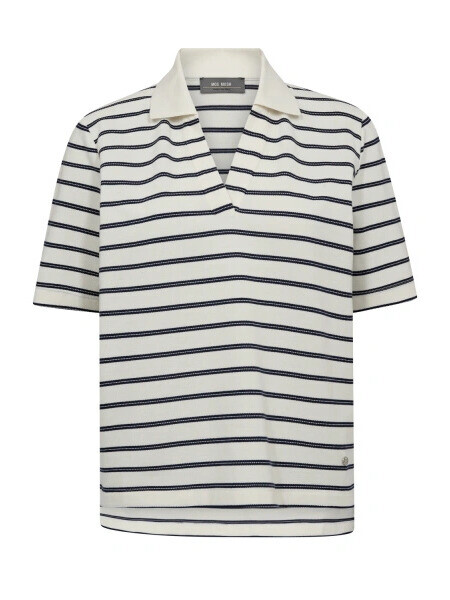 Smart kortærmet polo-shirt fra Mos Mosh. Fremstillet i blød og behagelig kvalitet, har skjorten en klassisk råhvid base med tynde, blå vandrette striber, der giver et tidløst look. Den åbne V-hals med krave tilfører et afslappet, men stilfuldt touch, perfekt til både hverdag og weekend.