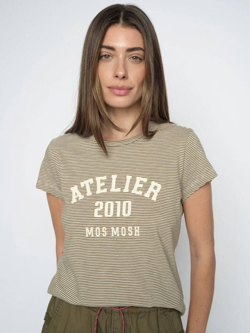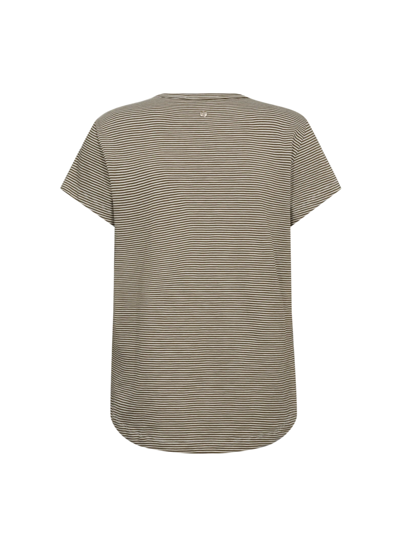 Smart grøn stribet T-shirt fra Mos Mosh. Denne stribede T-shirt har et afslappet og tidløst udtryk med rund hals og korte ærmer. Den bløde kvalitet og den behagelige pasform gør den ideel til hverdagsbrug. Style den med jeans, shorts eller under en blazer for et ubesværet, casual look.
