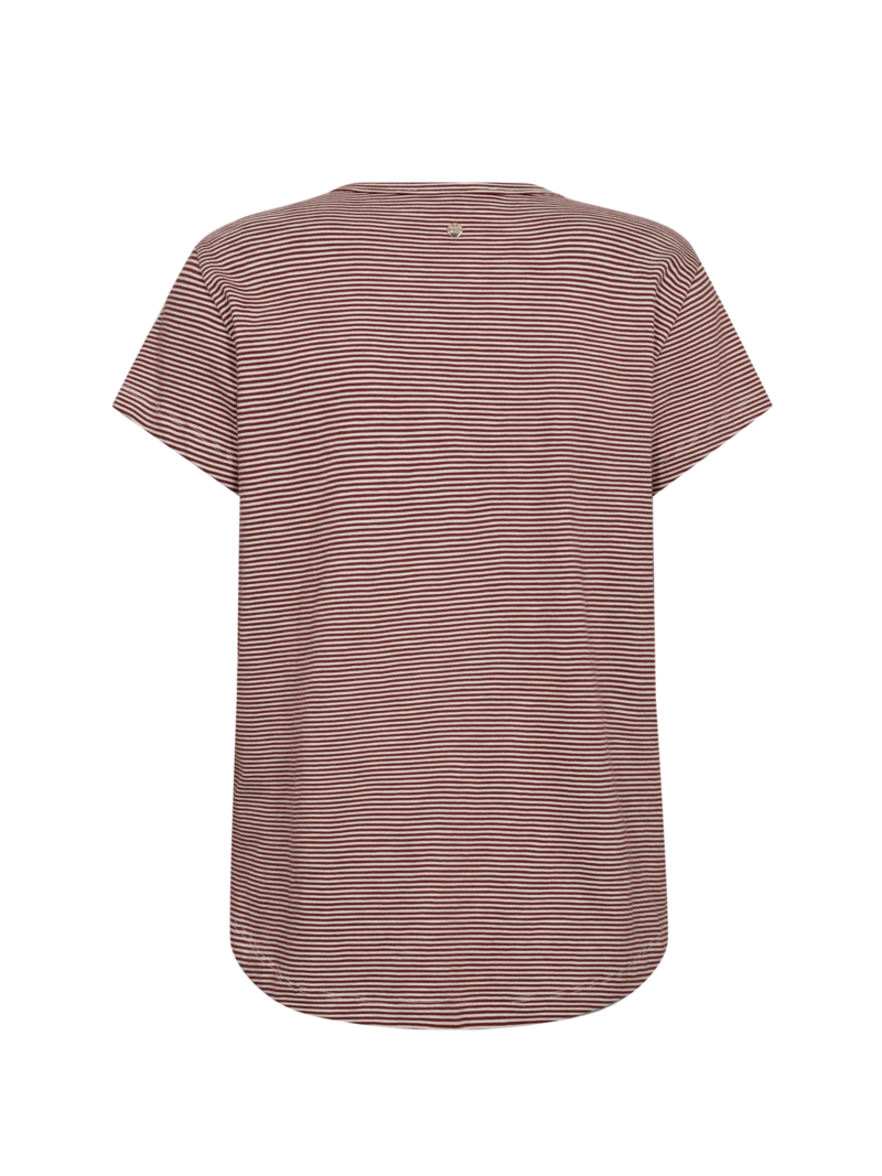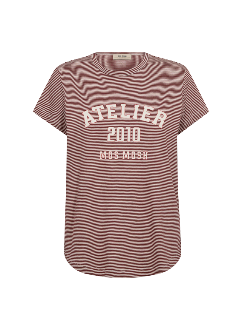 Smart rød stribet T-shirt fra Mos Mosh. Denne stribede T-shirt har et afslappet og tidløst udtryk med rund hals og korte ærmer. Den bløde kvalitet og den behagelige pasform gør den ideel til hverdagsbrug. Style den med jeans, shorts eller under en blazer for et ubesværet, casual look.