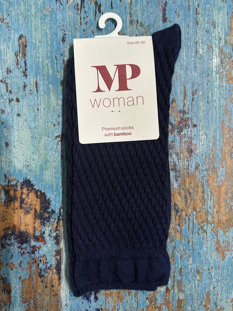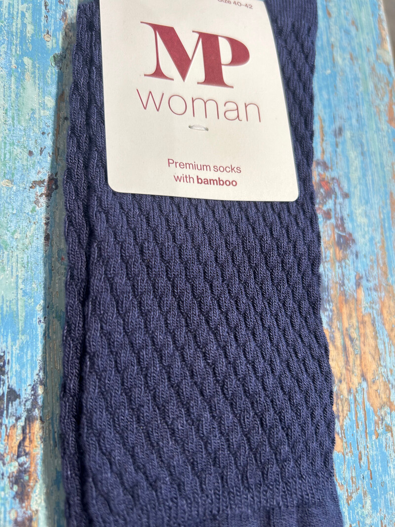 Søde strømper fra MP denmark. Strømperne er navy med struktureret mønster.