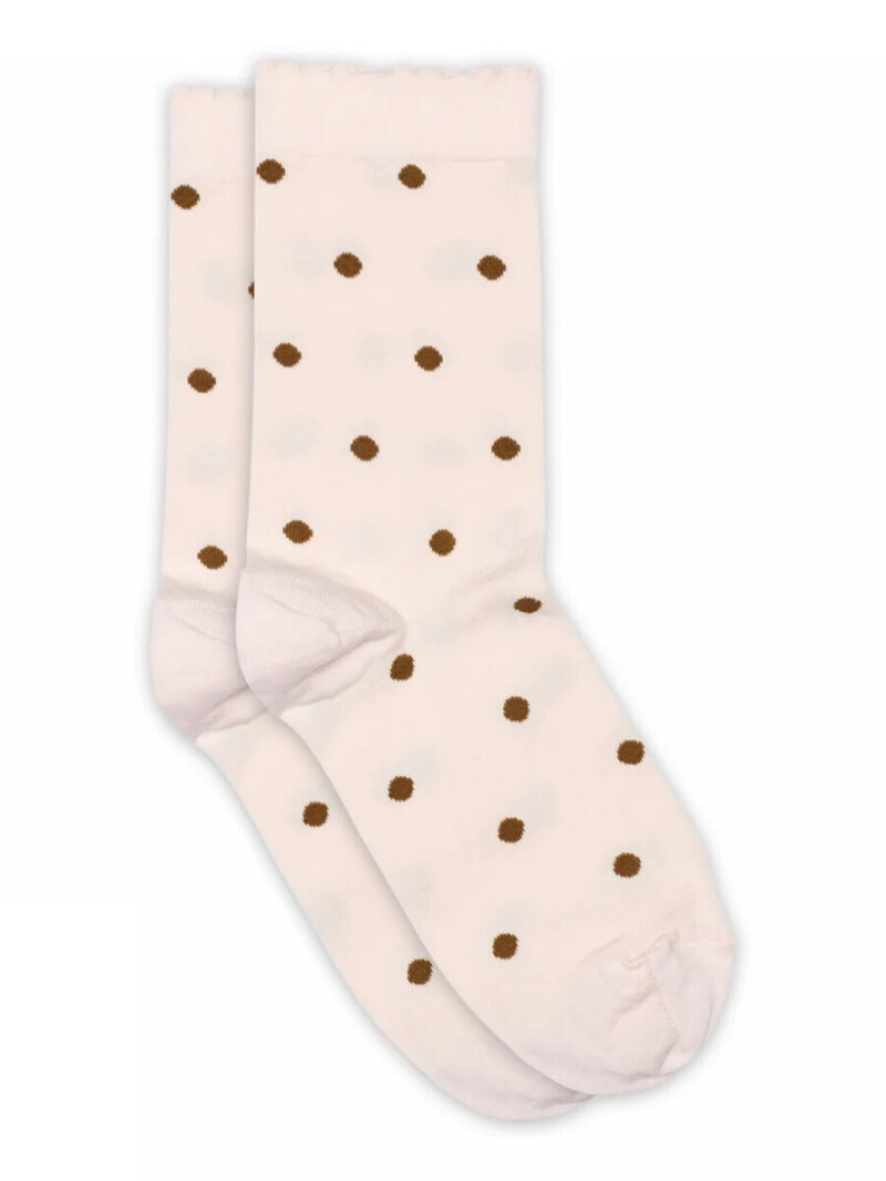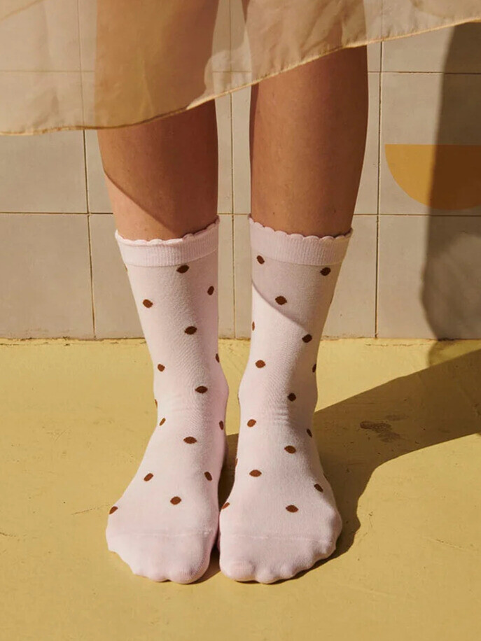 Søde strømper fra MP. Strømperne er lyserøde med lysebrune prikker. Kanten er bølget, hvilket tilføjer et feminint touch.