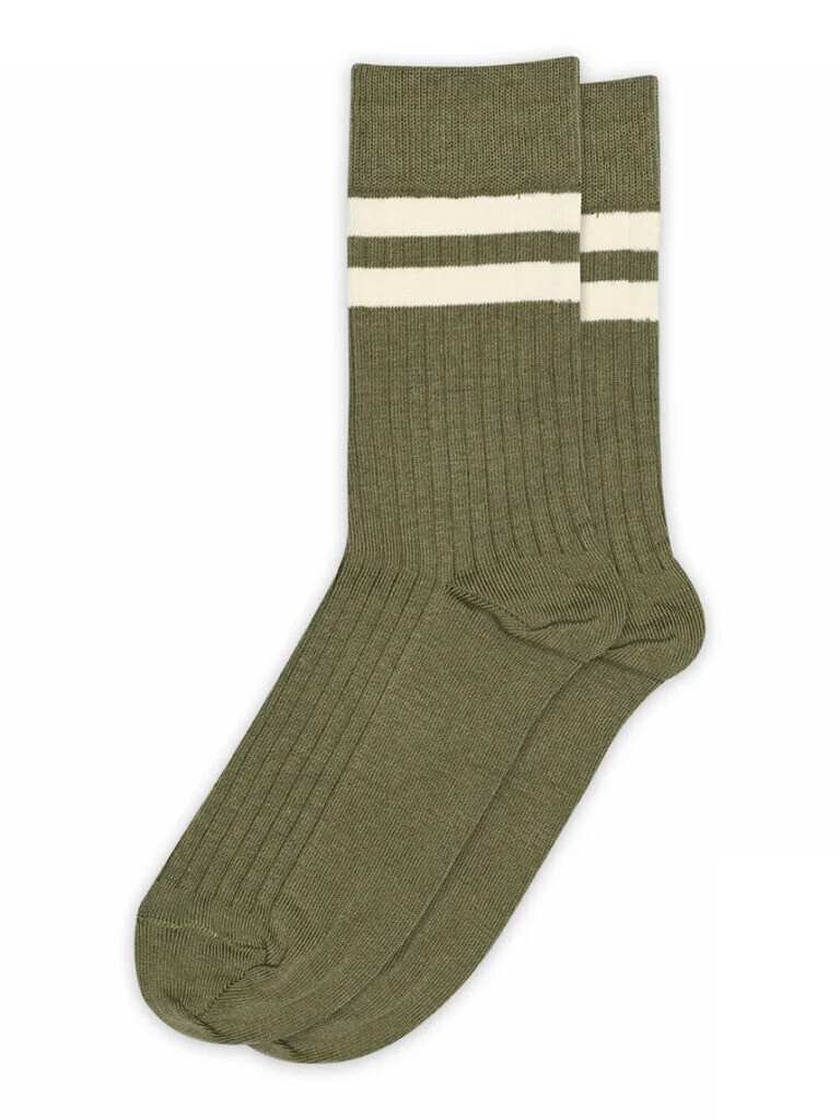 Lækre bomuldsstrømper fra MP. Strømperne er grønne med to hvide striber.
