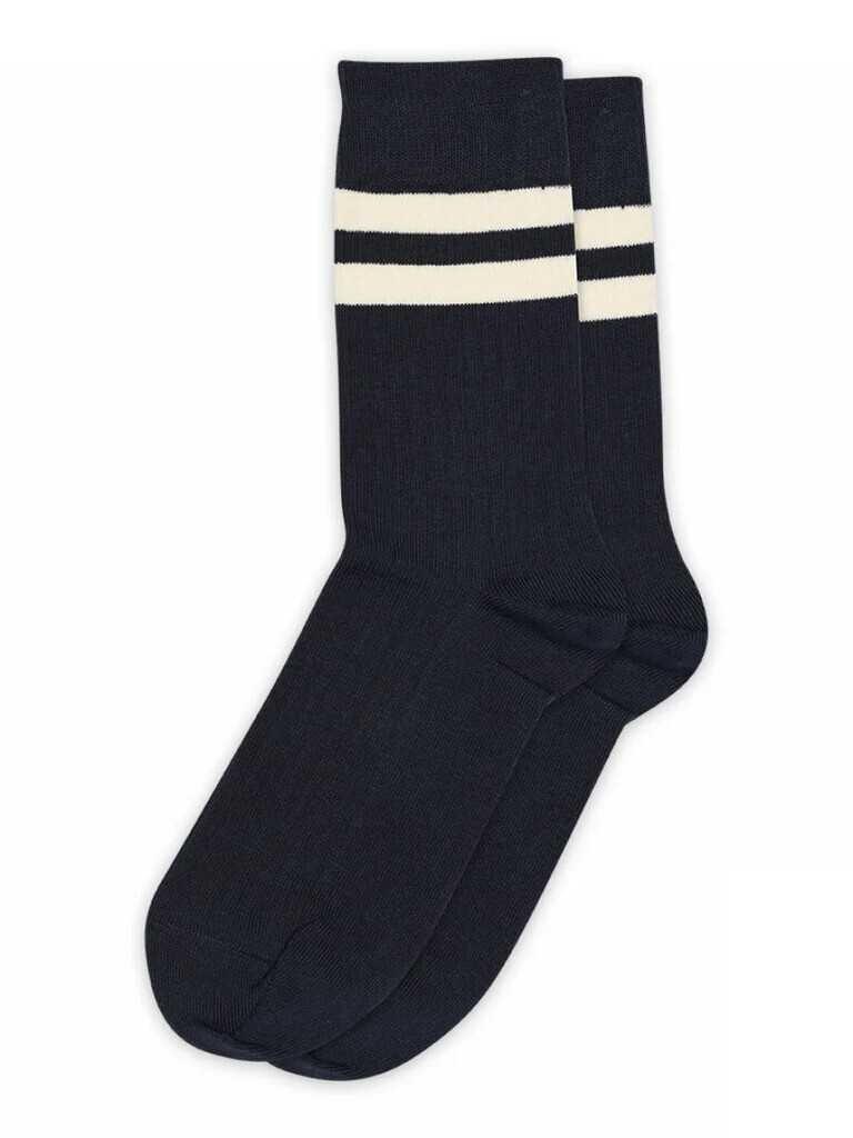 Lækre bomuldsstrømper fra MP. Strømperne er navy med to hvide striber.