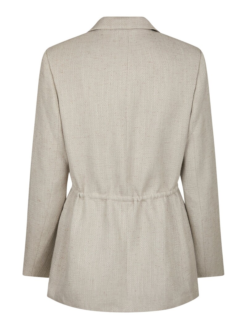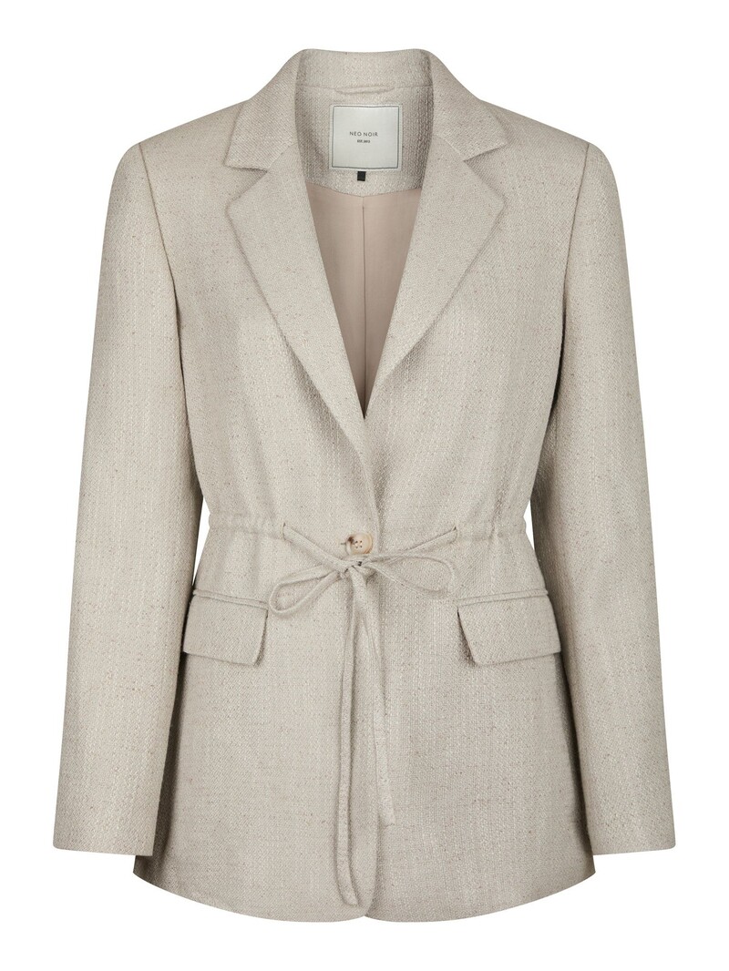 Smukkeste beige blazer fra Neo Noir i bouclé kvalitet. Blazeren er klassisk med knaplukning, og har den unikke detalje med bindebånd. Den har frontlommer med flap.