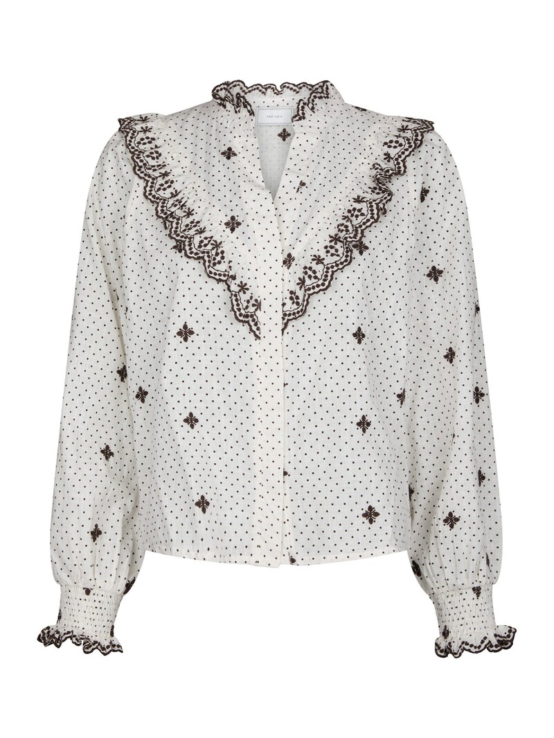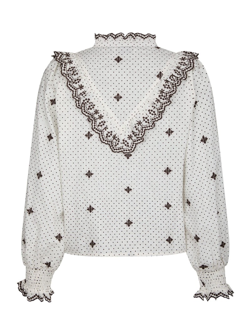 Sødeste bluse med smukke brune detaljer fra Neo Noir. Blusen har lange ærmer med smock og flæser for enden. Bagtil og foran over brystet og skuldrene er der søde flæsede detaljer som er med til at give blusen dens feminine udtryk. Kraven har også flæser og derudover har skjorten prikker og søde broderier.