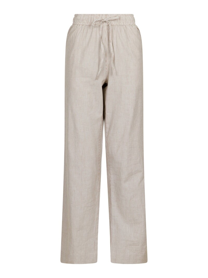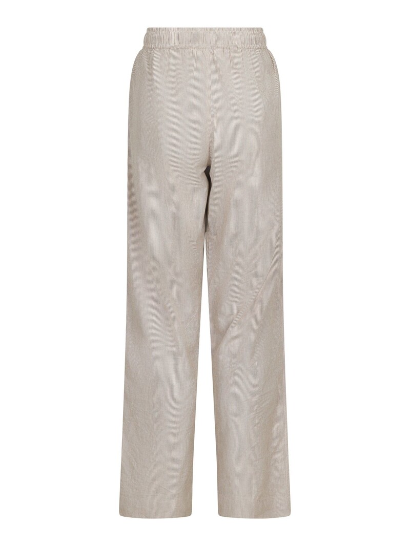 Casual og cool bomulds bukser i en blød stribet kvalitet fra Neo Noir. Bukserne er sandfarvet med hvide smalle striber. De har brede ben og elastik samt snor i taljen.