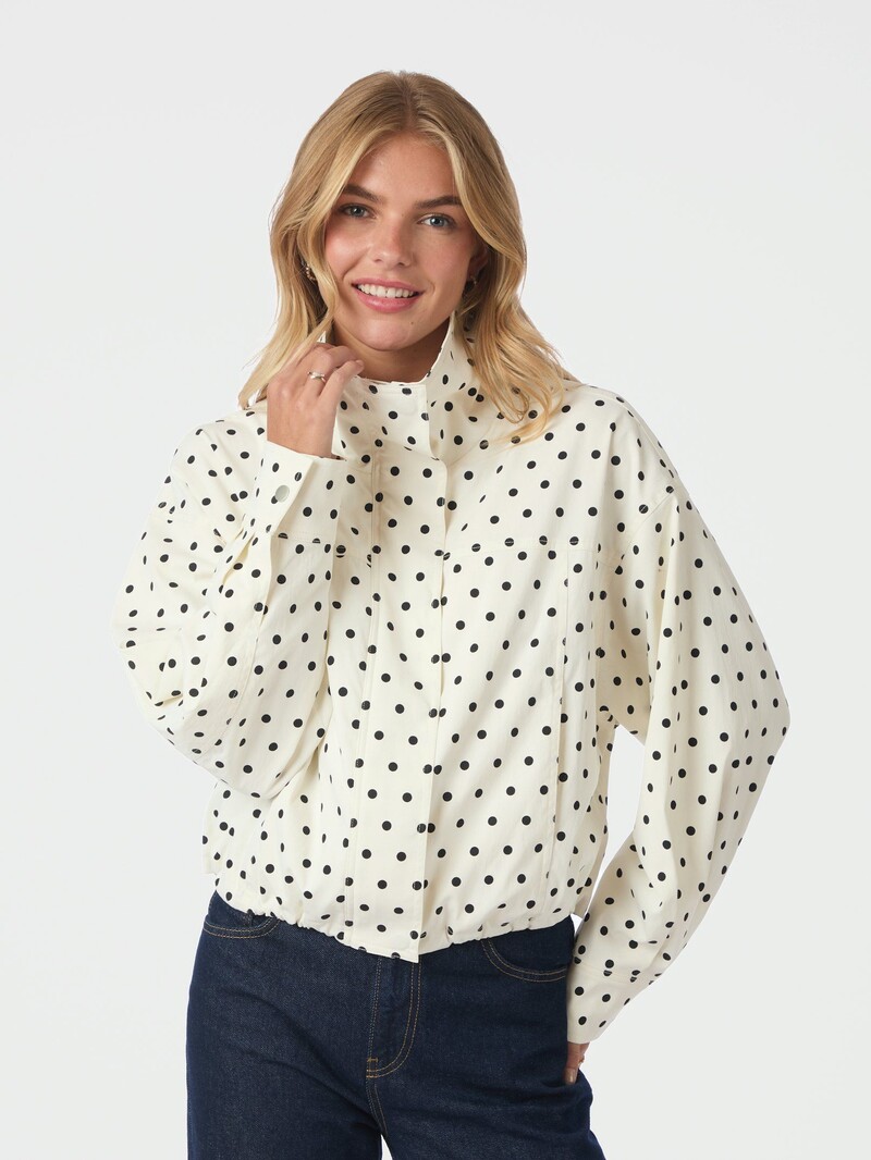 Sød forårsjakke fra Neo Noir i et prikket twill. Jakken er kort og har lynlås foran. Kanten kan justeres med elastiske stropper, og jakken har lommer i siderne.