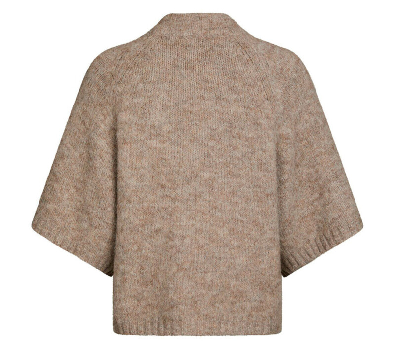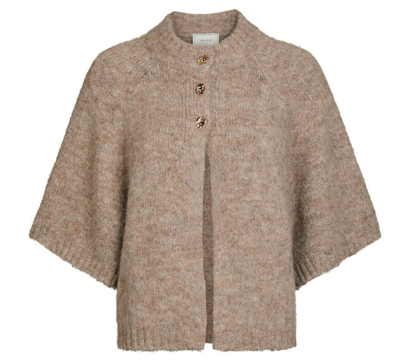 Smukkeste, blødeste strik cardigan fra Neo Noir. Denne strikkede cardigan er designet med tre guldknapper med struktur øverst og åbenstående forneden. Den har en højere hals og 3/4 ærmer, som er med til at give et både afslappet men fint og feminint udtryk.