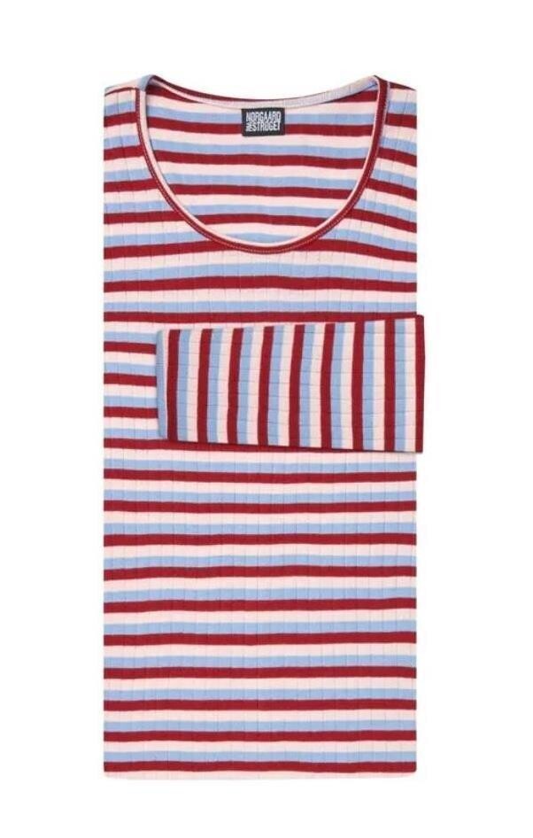 #101 T-shirt med striber fra Nørgaard på Strøget. T-shirten er designet i 1967 af Jørgen Nørgaard. Den er strikket, farvet og syet i Danmark og lavet i 100% bomuld.