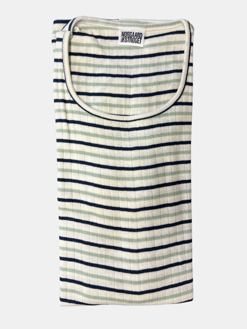 #101 T-shirt med striber fra Nørgaard på Strøget. T-shirten er designet i 1967 af Jørgen Nørgaard. Den er strikket, farvet og syet i Danmark og lavet i 100% bomuld.