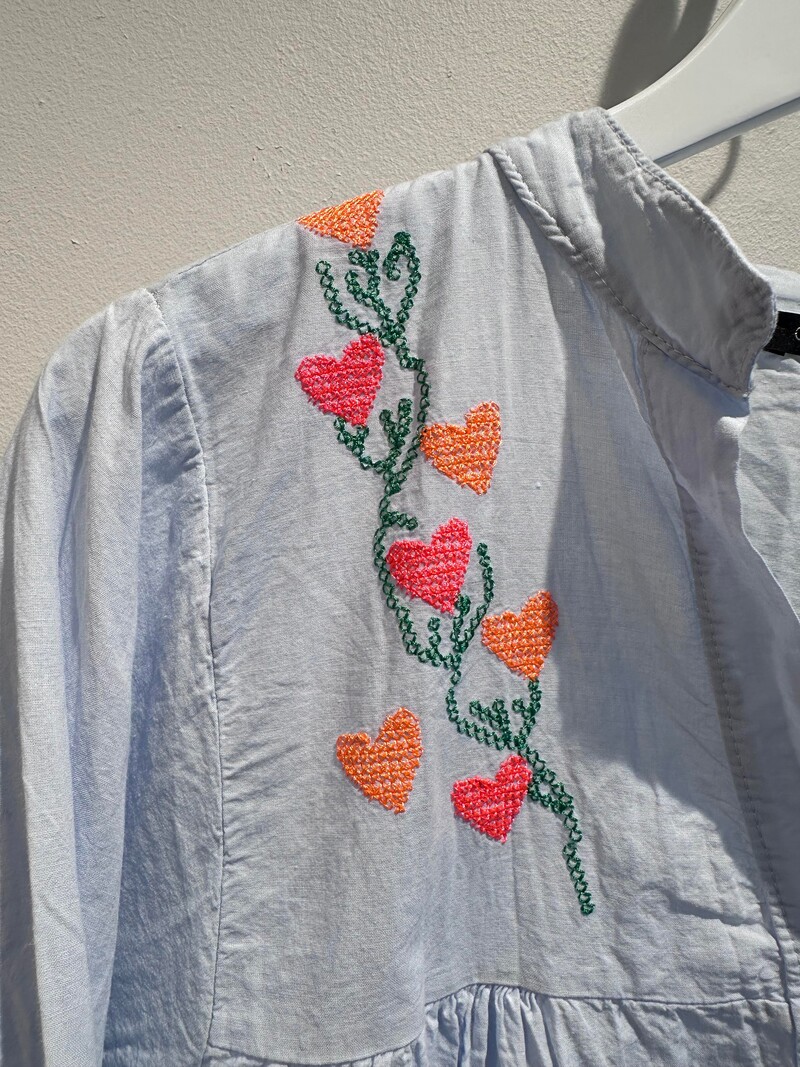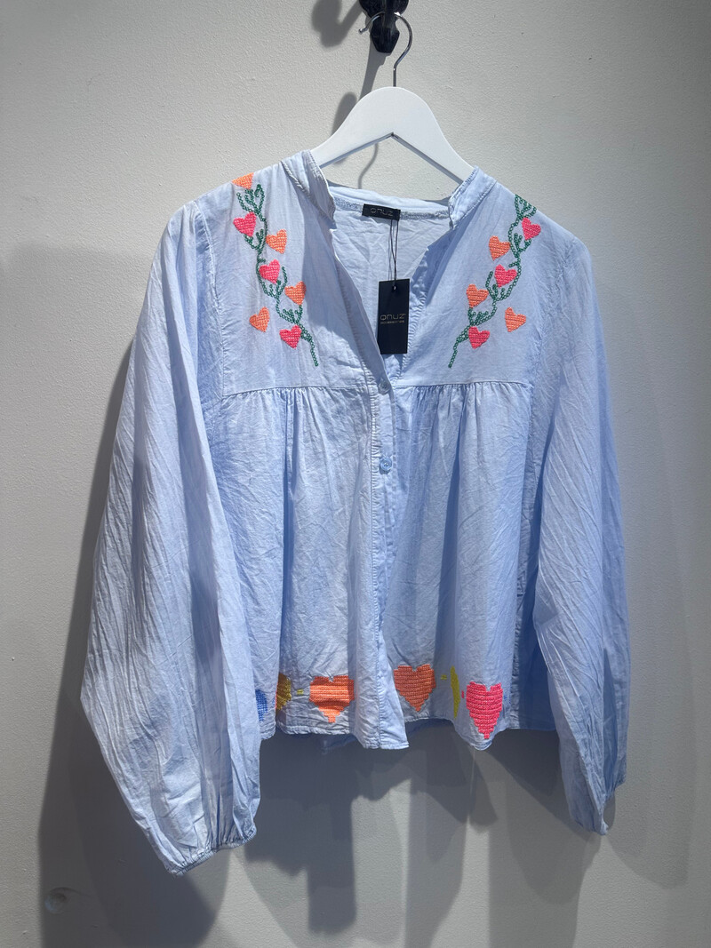 Sødeste blå skjorte fra Qnuz. Skjorten har lange ærmer, v-udskæring og er gennemknappet. Ærmerne afsluttes med ballon effekt. De broderede hjerter i de friske farver tilføjer et touch af sommer.