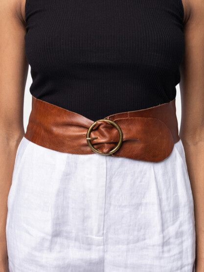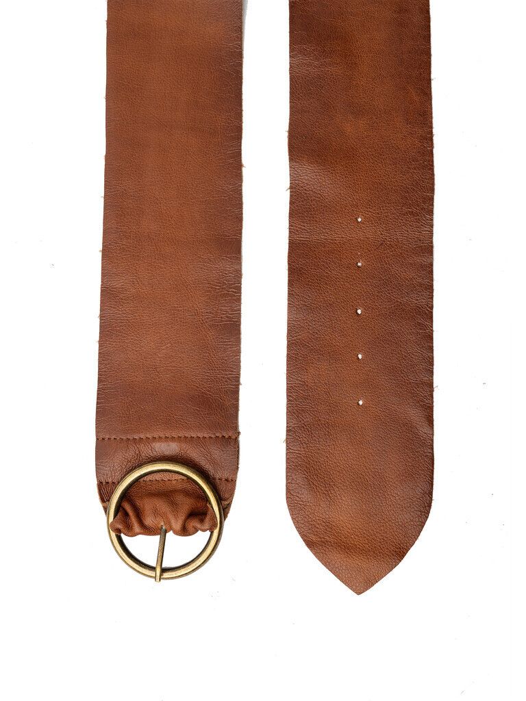 Smukt bælte i valnød farve fra Re: Designed. Dette bælte er let og bredt, og giver det fineste feminine touch til dit outfit. Det har en smuk rund guldring som lukning, der tilføjer et strejf af elegance og unikhed.