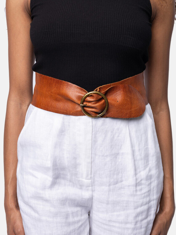 Hila-bæltet er et stilfuldt og bredt bælte, skabt til et moderne udtryk. Det lukkes med en elegant rund guldring, som giver designet et særligt præg af eksklusivitet og karakter.