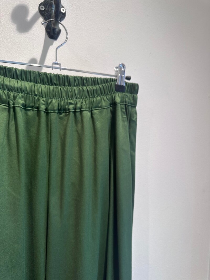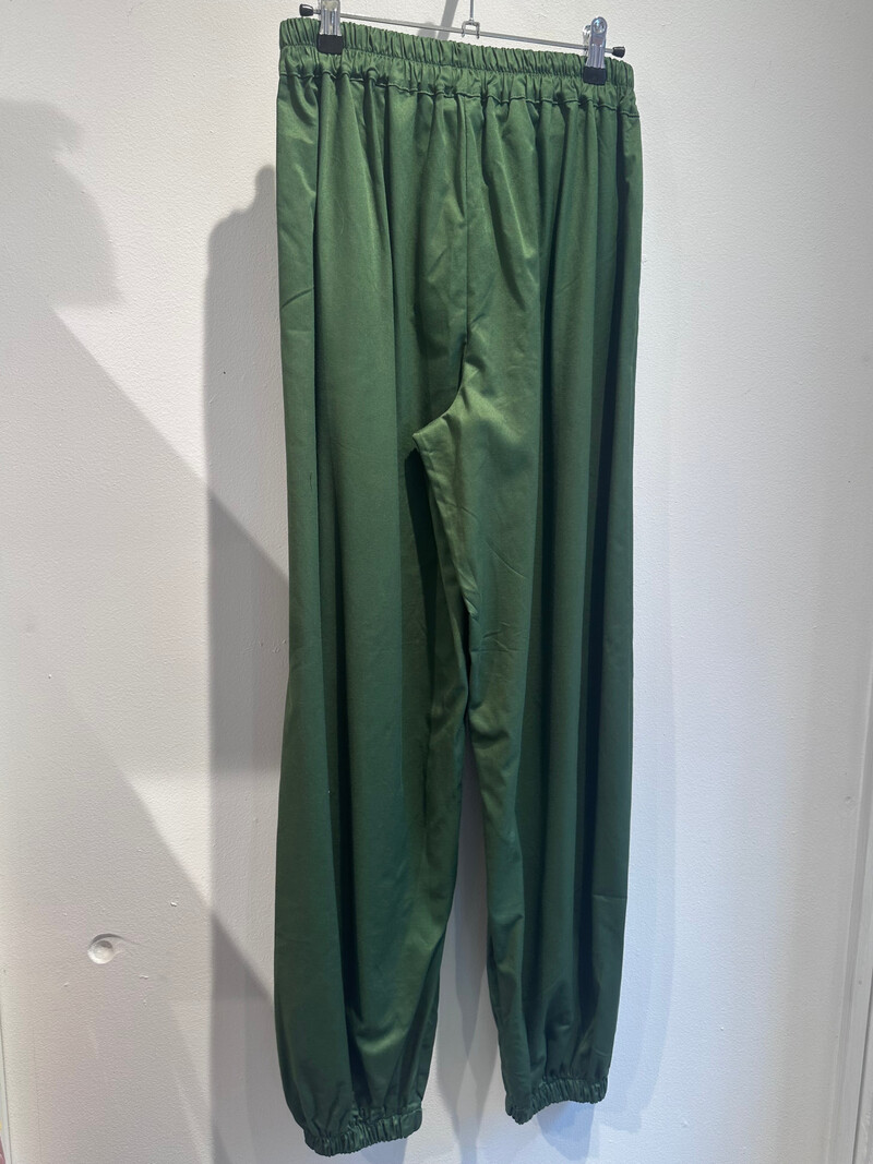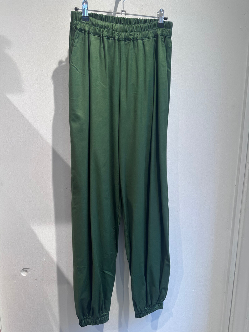 Smarte mørkegrønne ballon bukser fra Wauw. Bukserne har sidelommer og en elastik kant i taljen, som gør at de tilpasser sig kroppen, så de er behagelige at have på hele dagen. De har brede ben med elastik for enden, som skaber en ballon effekt. De er perfekte til både hverdag og særlige anledninger, da de let kan dresses op og ned, med deres shiny look.