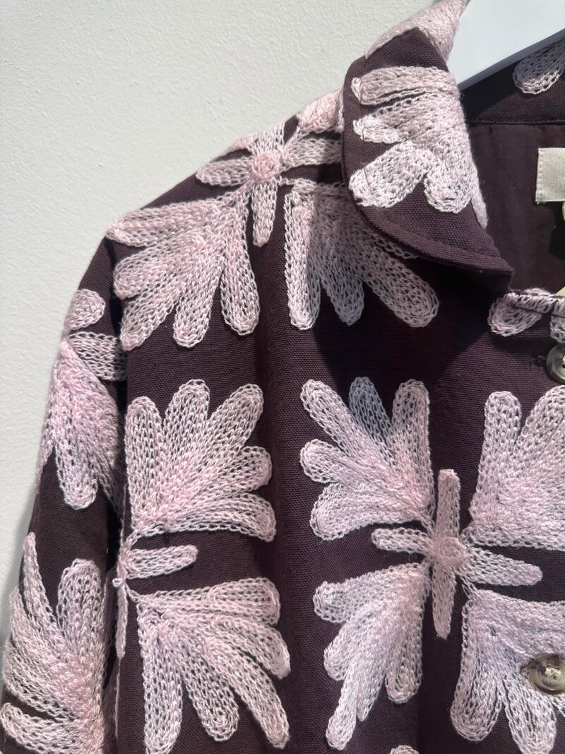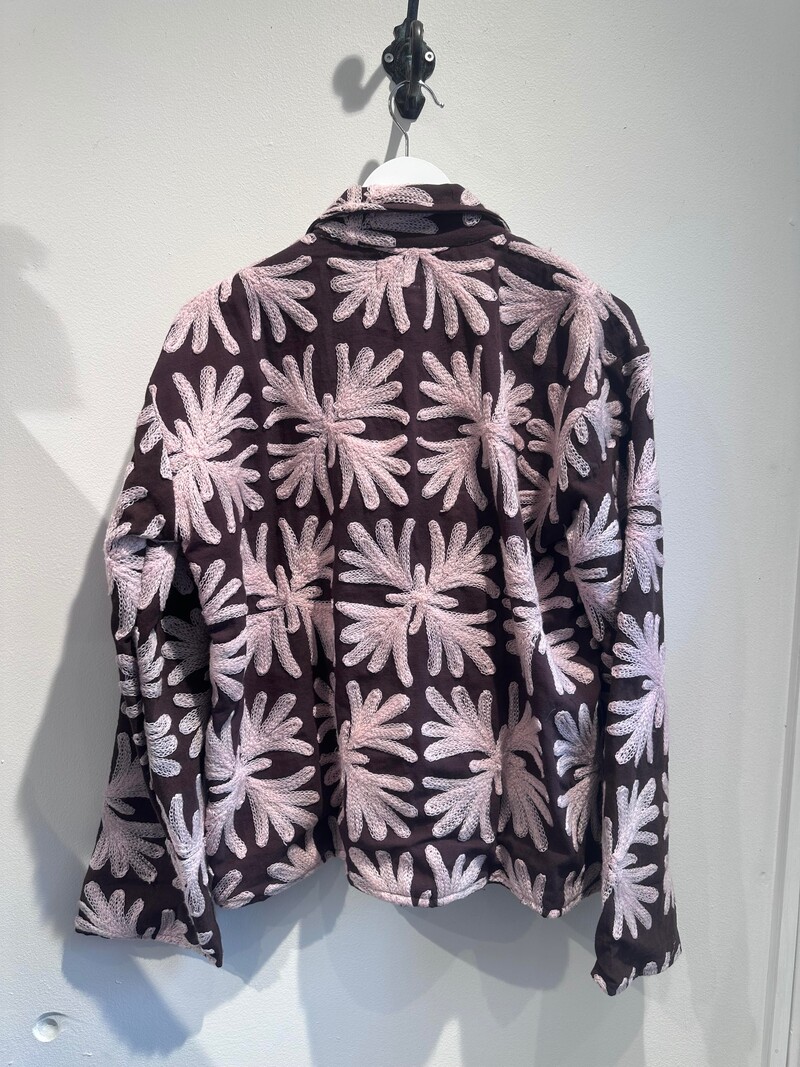 Smukkeste jakke fra Wauw. Jakken har lange ærmer, og dens afslappende pasform gør den behagelig at have på hele dagen. Den er brun med rosafarvede, smukke broderier. Jakken er et mix af cool og afslappende.