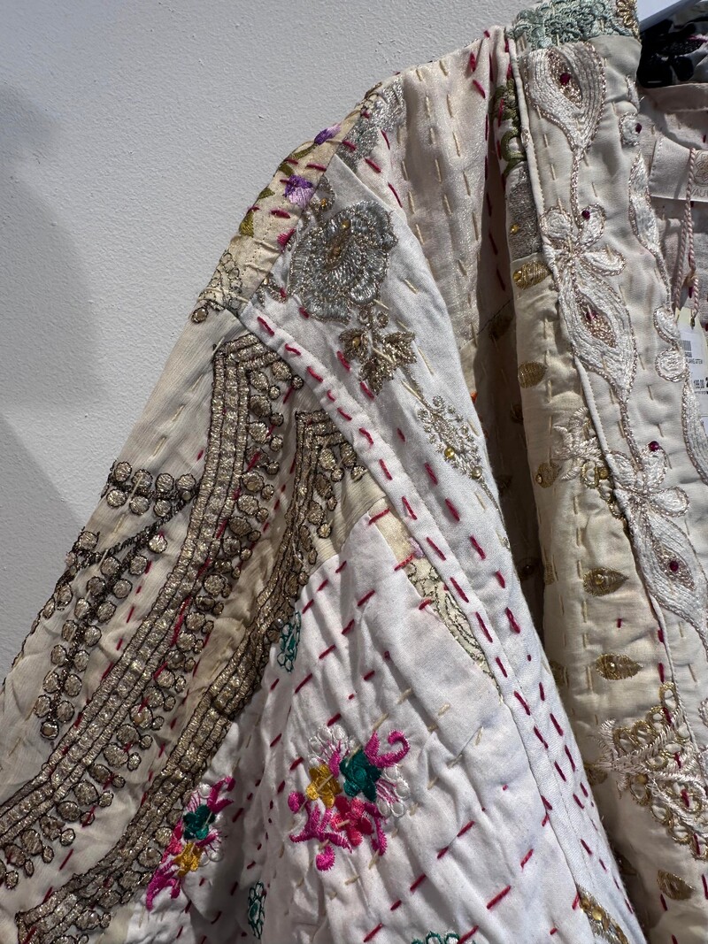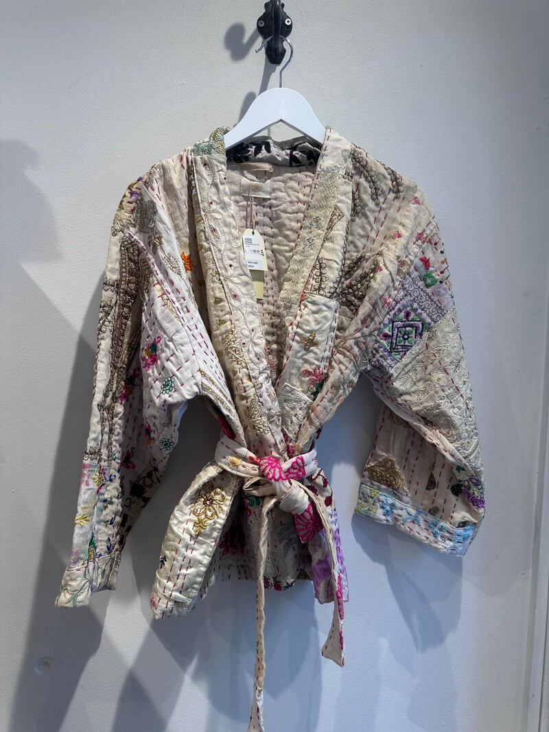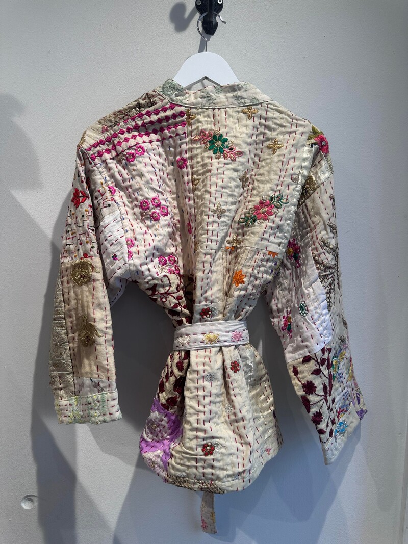 Smukkeste farverige jakke fra Wauw. Jakken er quilted, i en lys farve med de fineste broderier i adskillige farver, hvilket giver den et eksklusivt og feminin præg. Hver jakke er unik, da de alle er forskellige. Det tilhørende bindebånd kan sættes i taljen, for at give jakken en feminin silhuet.