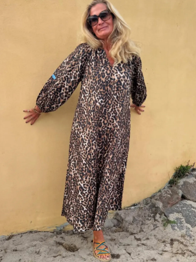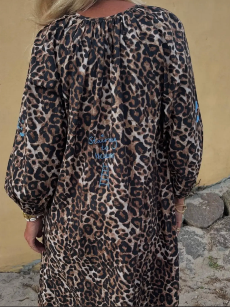 Smuk kjole i leo print fra Wauw. Den har en v-udskæring, 3/4 ærmer med elastik, lommer i siderne og en rund hals. Der er små fine broderinger over kjolen.