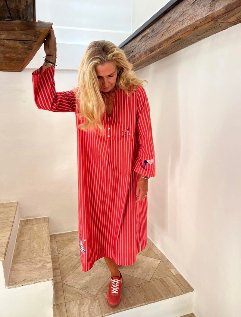 Smukkeste kjole i rød og lyserød fra Wauw. Kjolen er lang, har lange ærmer og en v-hals med knapper som giver kjolen et feminint udtryk. De søde broderede motiver tilføjer et sommerligt præg og gør den helt unik. Ærmerne har balloneffekt med elastik i enden.